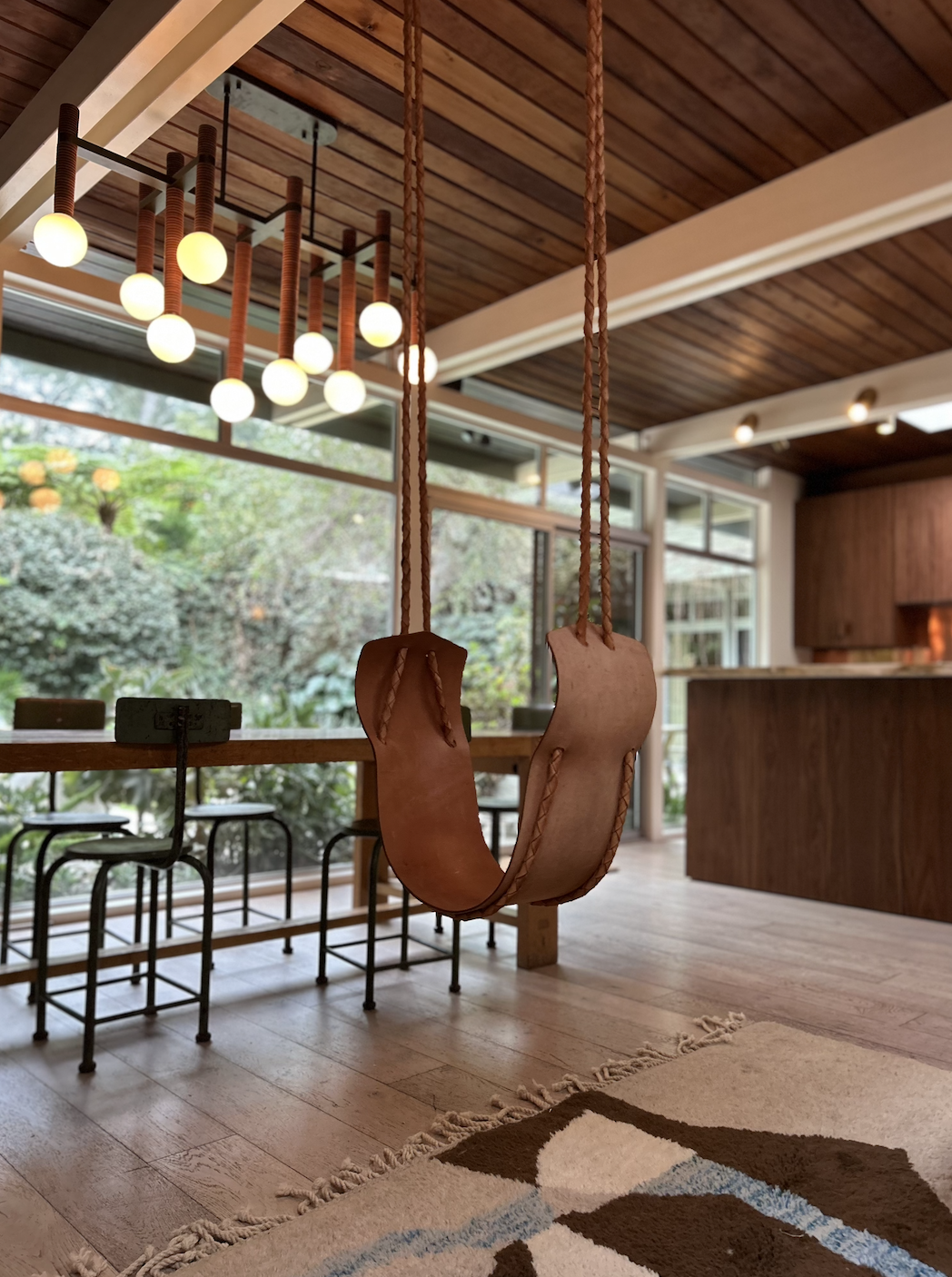 Recently, we welcomed a custom handwoven Luz rug from Pampa for the primary bath and the most beautiful leather Porteño swing for the living room, delivered by Nick Osika and installed with Kevin after an afternoon spent talking music and learning about the story behind the swing’s collaboration with Argentinian designer Agostina Branchi. Crafted from saddle leather with handwoven horse reins inspired by Argentine Gauchos, the piece is made by artisans using traditional techniques and sourced at a fair price.
