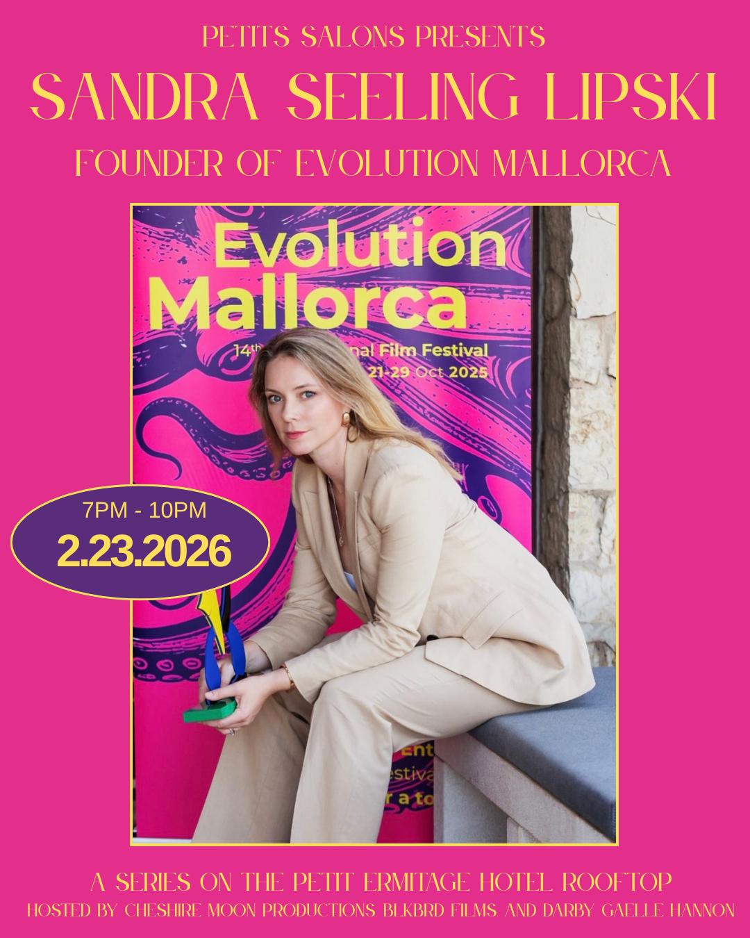 On Monday, February 23rd at Petits Salons, we celebrated a night of short films from Evolution Mallorca Film Festival, as well as the festival’s incredible founder Sandra Seeling Lipski.